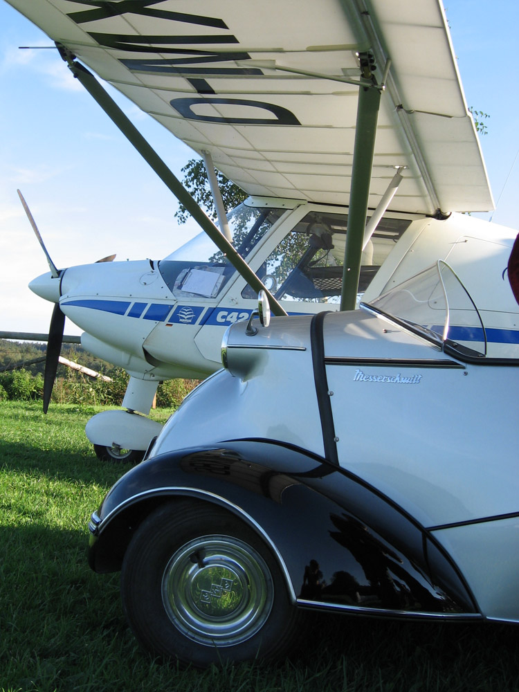 Mit meinem Ultraleichtflugzeug flog ich heute zu einem Ultraleichtfahrzeug – ich traf Robert Eder bei Peissenberg auf einem kleinen Flugplatz, wo er mir seinen Messerschmitt Sport vorführte.