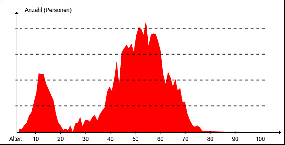 Der erste Berg sind Kinder zwischen 5 und 15 Jahren, und der zweite Berg sind Erwachsene zwischen 40 und 70 Jahren. Beide zusammen ergeben die typischen Touristen am Bodensee (im gesamten Durchschnitt vermutlich noch um 5 Jahre nach rechts verschoben, wenn man vom Rad-Touristen auf alle Touristen schließt).
