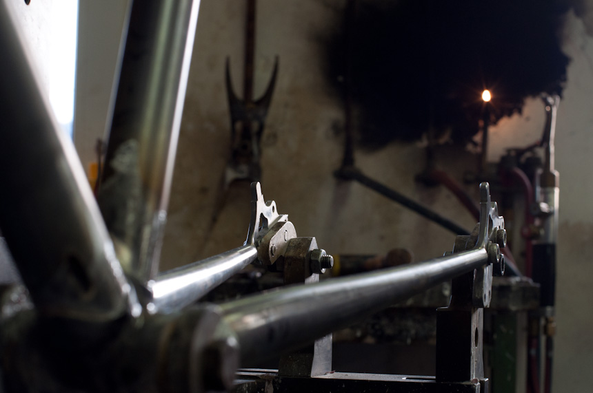 Nun beginnt die echte Handarbeit, für die es Jahrzehnte Erfahrung braucht: die Enden aller Rohre werden miteinander verlötet. Am Tretlager mithilfe einer Muffe, an allen anderen Stellen im so genannten Fillet-Brazed-Verfahren.